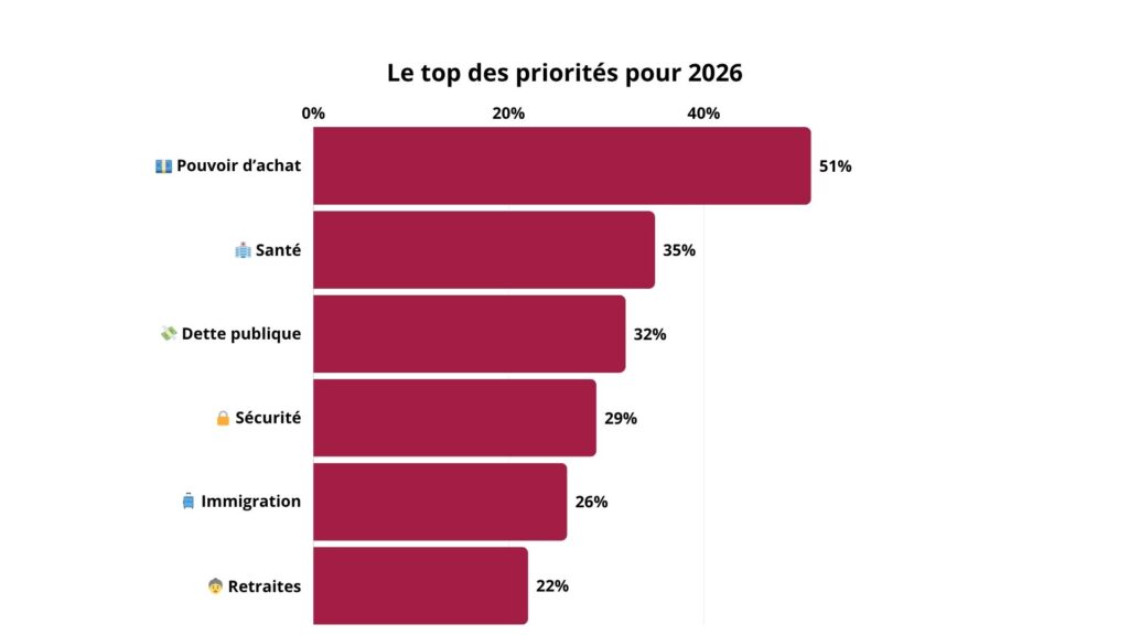 Dans la hiérarchie des priorités adressées au gouvernement, le pouvoir d’achat arrive largement en tête (51 %, en forte hausse), suivi par la santé (35 %) et la dette publique (32 %). Les retraites ne figurent qu’en sixième position (22 %), mais progressent nettement depuis septembre.