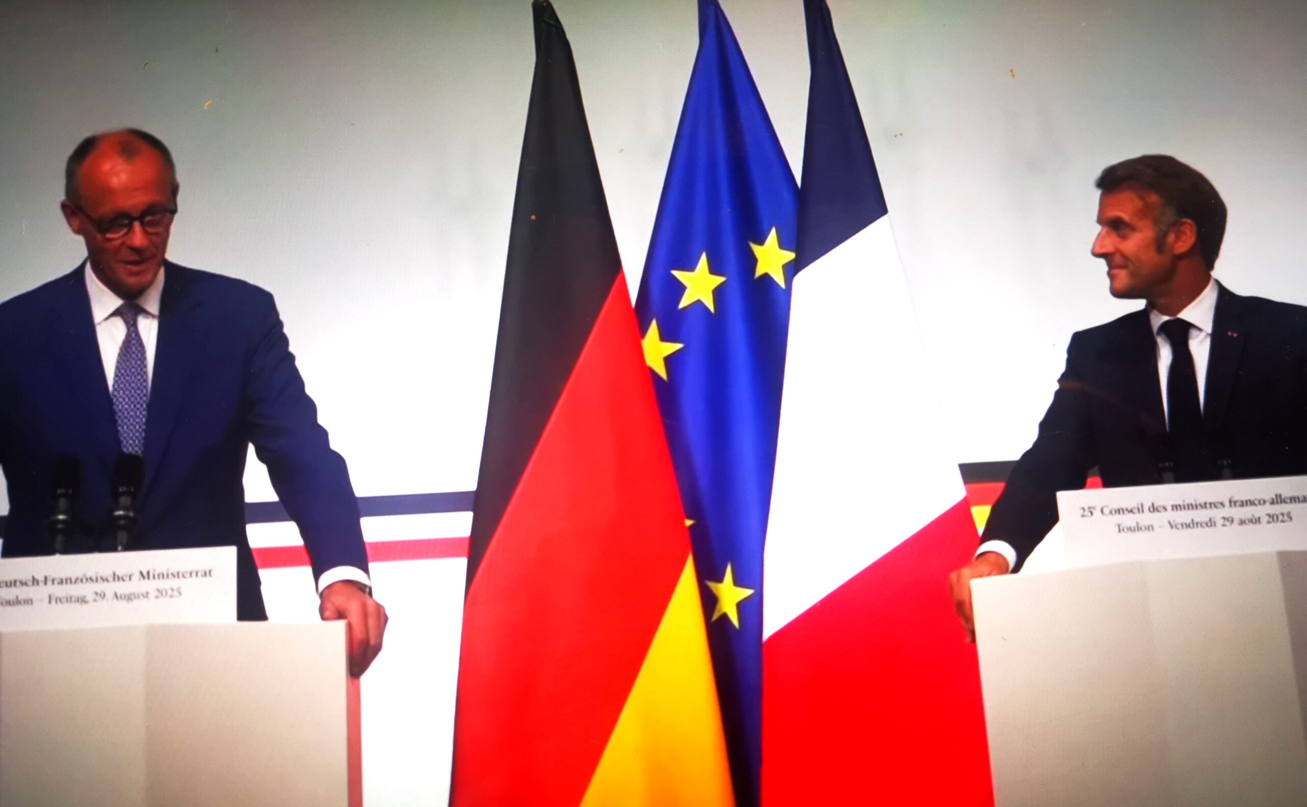 Emmanuel Macron et le chancelier allemand Friedrich Merz ont tenu vendredi 29 août à Toulon (Var) un conseil des ministres franco-allemand, suivi d'un conseil de défense conjoint, pour coordonner leurs actions et avoir une Europe "plus forte" face aux grands défis internationaux. Paris et Berlin souhaitent avec ce 25e conseil des ministres franco-allemand insuffler une nouvelle dynamique dans les relations entre les deux pays, mises à mal ces dernières années notamment sur la question énergétique.