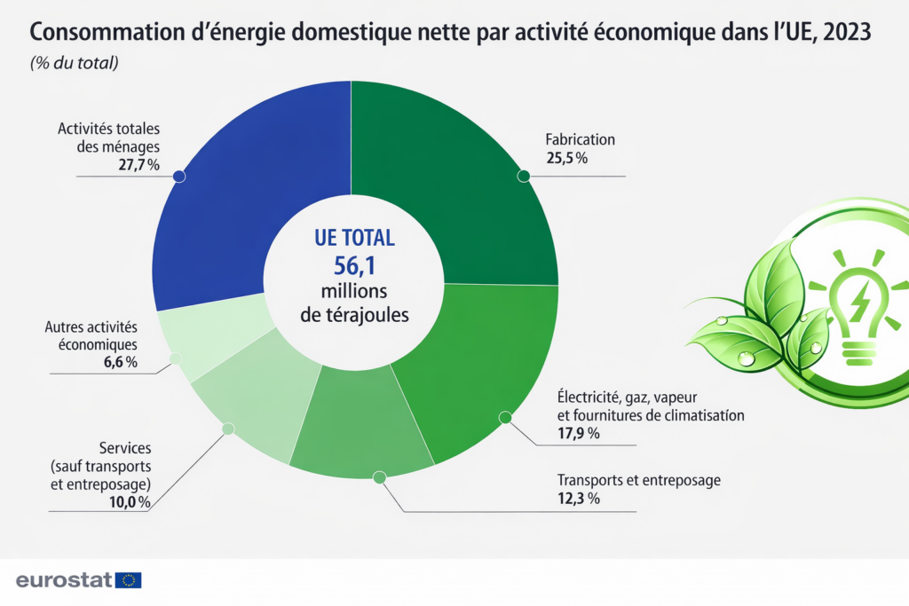 L’efficacité énergétique progresse dans l’économie européenne malgré des tensions sectorielles. Les entreprises et les administrations publiques ont représenté 72,3 % de cette consommation, le solde revenant aux ménages (27,7 %). La production industrielle demeure le premier poste énergétique du continent : le secteur manufacturier concentre à lui seul 25,5 % de l’énergie utilisée, devant la fourniture d’électricité, de gaz, de vapeur et de climatisation (17,9 %), puis le transport et le stockage (12,3 %).